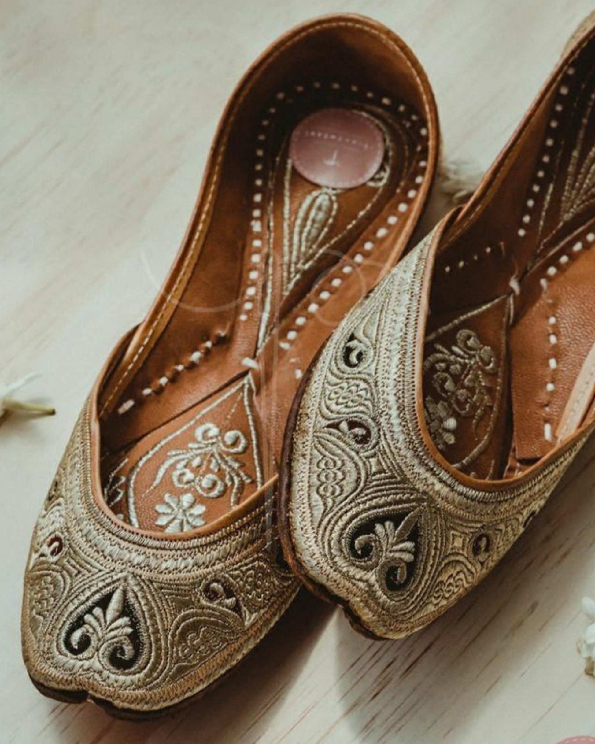 Rooted in Indian craftsmanship and timeless elegance, the Chaand Juttis celebrate traditional artistry with a refined, contemporary finish. Handcrafted with intricate zari and thread embroidery, this pair reflects the richness of Mughal-inspired motifs and age-old jutti-making techniques. The soft silhouette, detailed vamp work, and earthy gold tones make these juttis an effortless companion for festive dressing, weddings, and elevated ethnic looks. True to Avere’s design philosophy, this style bridges heritage craftsmanship with modern styling for today’s conscious luxury consumer.