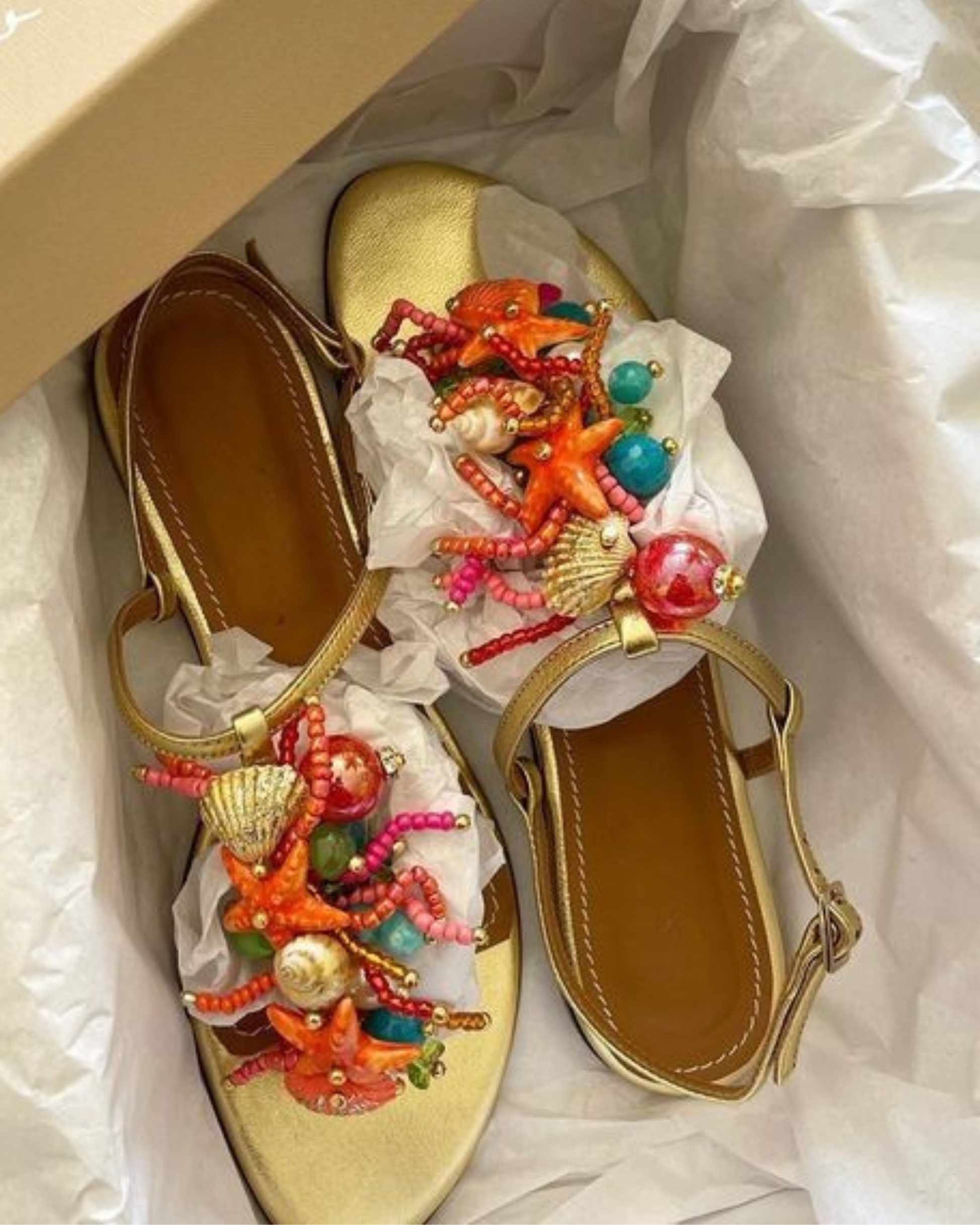 Playful, vibrant, and vacation-ready, the Coral Cove Flats capture the spirit of seaside glamour. Featuring hand-applied shell, bead, and coral-inspired embellishments, this pair brings a burst of colour and texture to relaxed resort dressing. The slim ankle strap ensures a secure fit, while the flat sole keeps things easy and wearable.