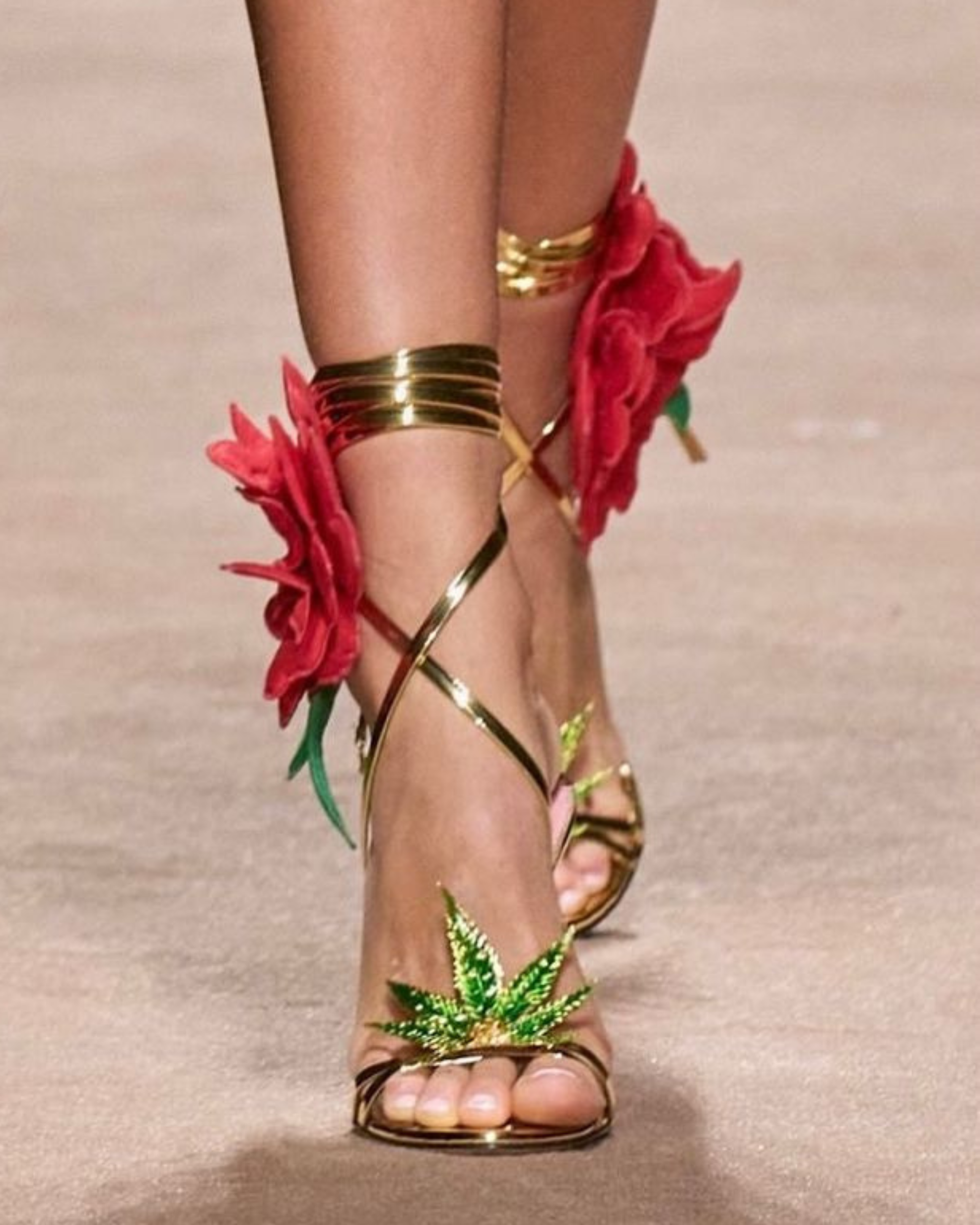 Bold, botanical, and unmistakably runway, the Crimson Eden Wrap Heels are designed to blur the line between footwear and wearable art. Featuring metallic gold straps intertwined with vivid 3D floral appliqués, this pair channels high-fashion Autumn/Winter runway drama. Sculptural flower detailing climbs the ankle, while leaf-inspired accents add an unexpected couture edge.