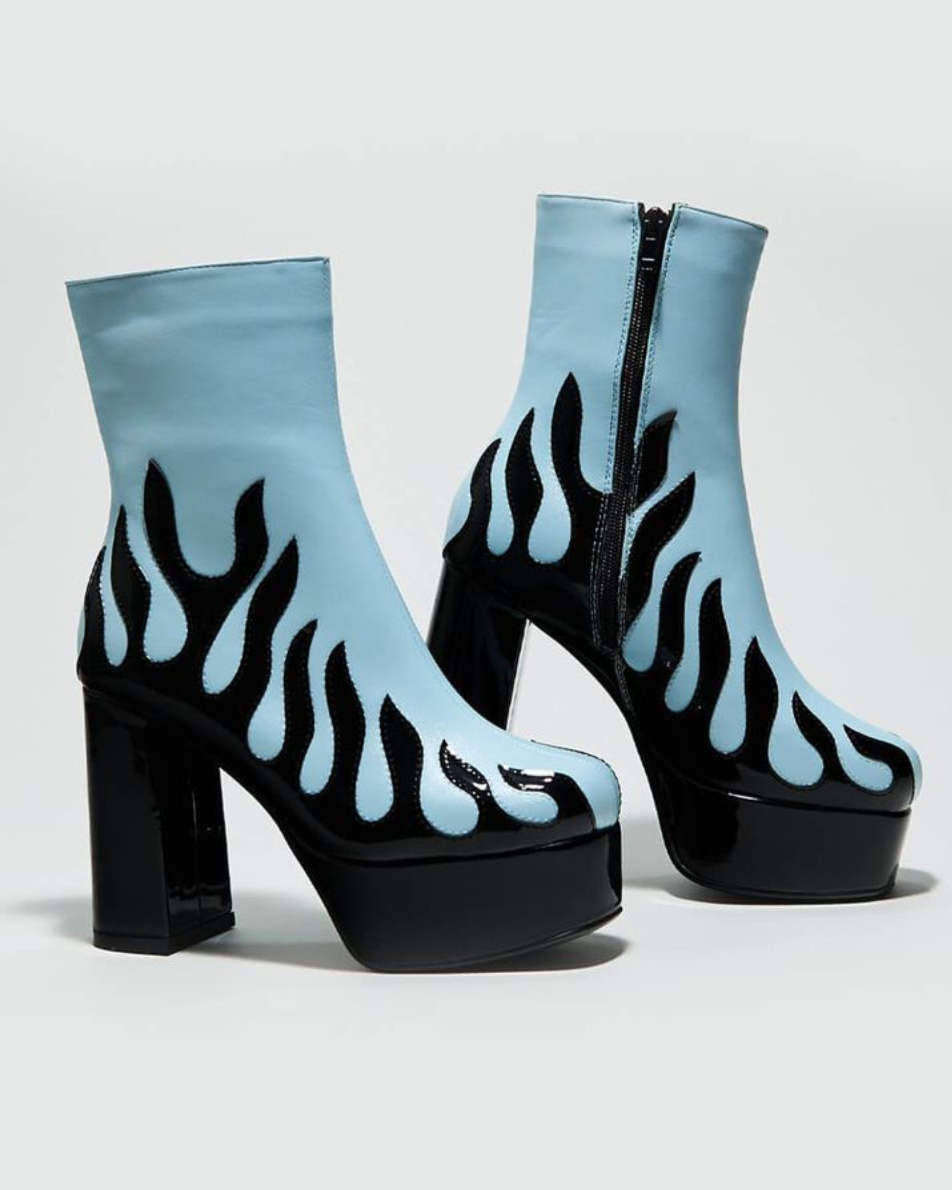 Fierce flames meet a cool toned attitude these sky-blue platform ankle boots redefine power dressing with a rebellious twist. The glossy black flame appliqué wraps boldly around the upper, while the high block heel and elevated platform create a dramatic silhouette with surprising comfort. Sleek, structured, and built to stand out, this pair delivers instant edge to everything from streetwear layers to performance ready looks.