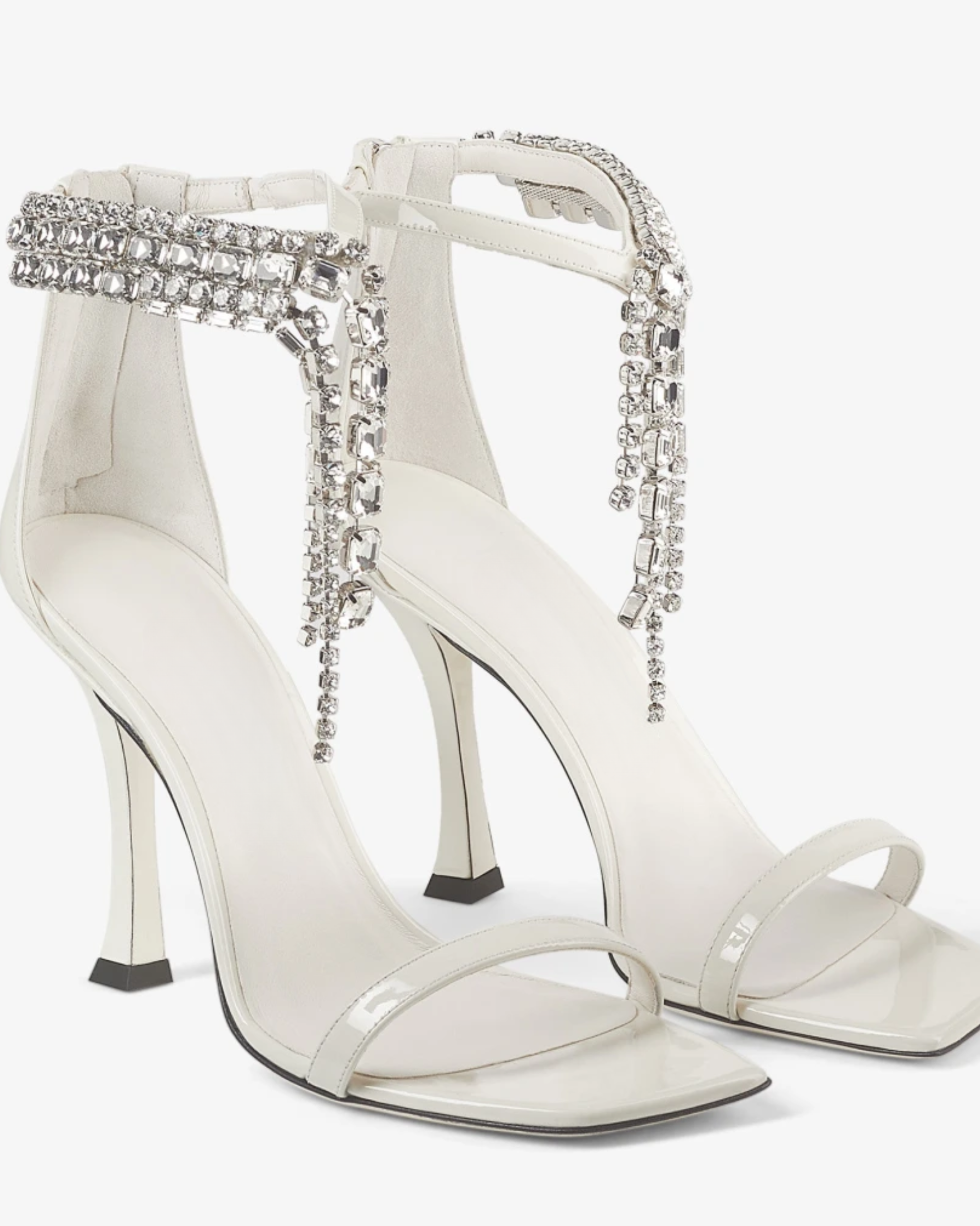 Radiant, refined, and effortlessly elegant, the Gilded Aurora Heels are crafted for contemporary bridal glamour. Designed in a sleek metallic silver finish, this pair features delicate ankle straps adorned with cascading crystal embellishments that shimmer with every step.