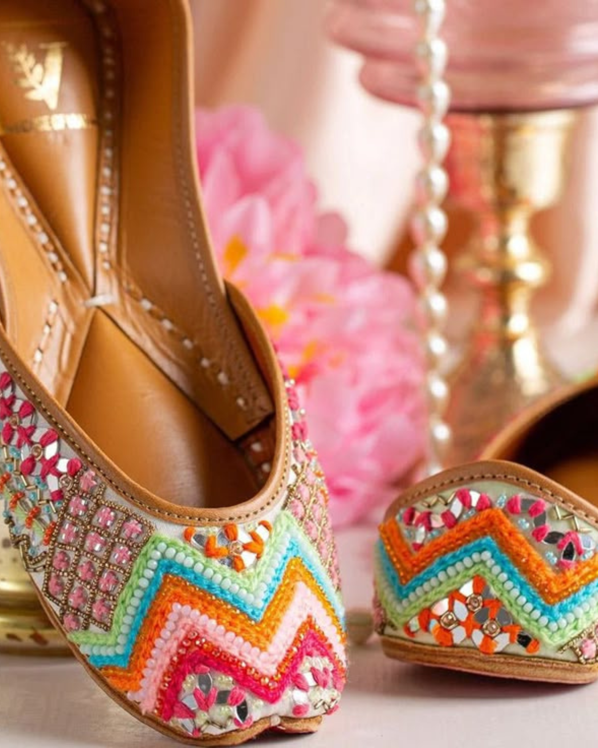 Let Gulnaz Jutti become a canvas for bold storytelling. Wrapped in a warm tan embrace, these handcrafted juttis burst with chevron beadwork in dreamy pastels and luxe jewel tones that refuse to whisper. It's tradition with a wink, the timeless jutti shape nods to Indian roots while cheeky geometric patterns keep things fresh and unexpected. Every bead tells a tale of artisanal mastery, blending heritage craftsmanship. Perfect for those who believe footwear should spark joy and conversation. Avere's carefully curated pick brings colour, character, and couture quality detail to ethnic footwear that actually has personality.