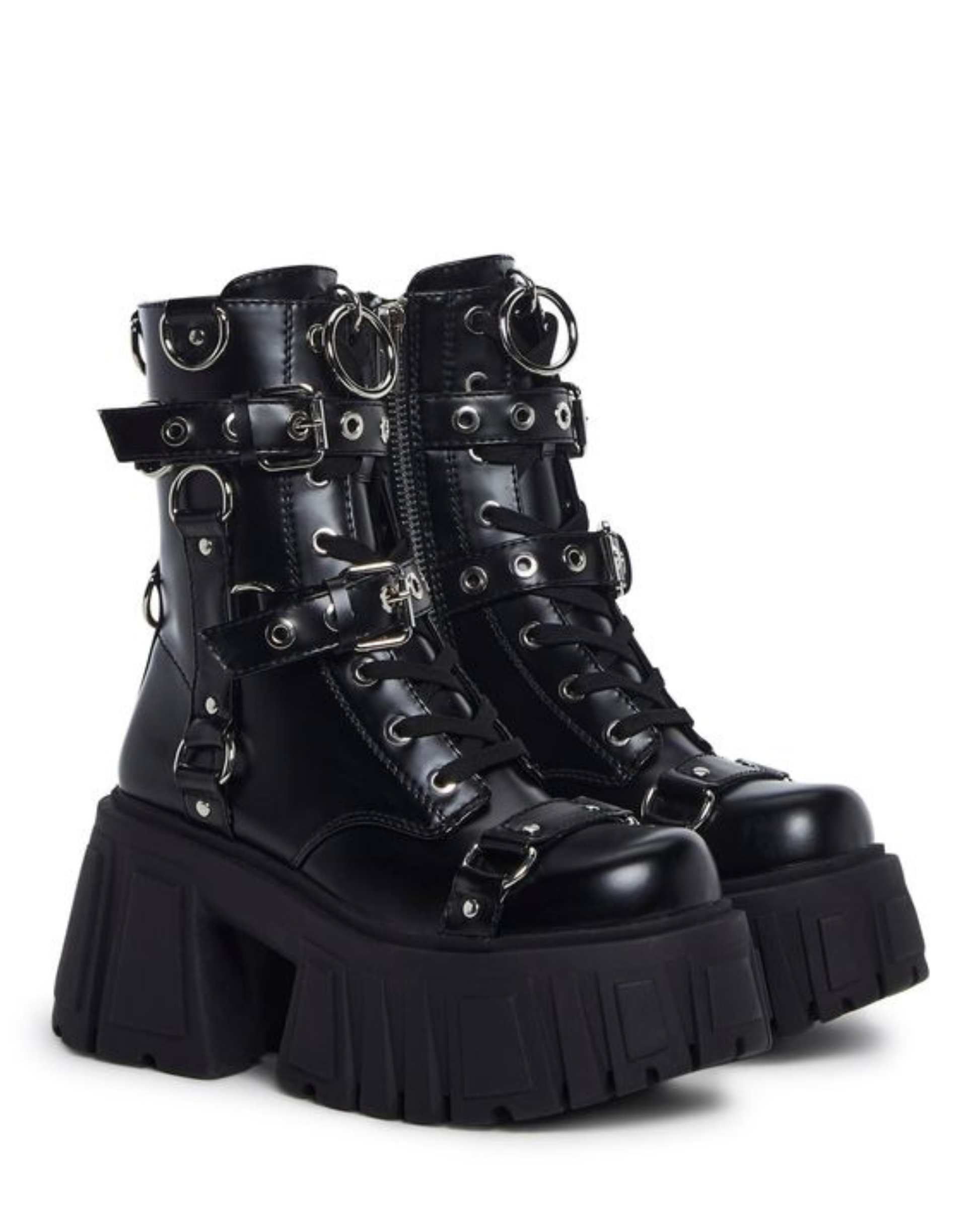 Dark, bold, and unapologetically rebellious the Obsidian Grind Combat Boots are crafted for fearless self-expression. Designed in a sleek black finish, this pair features layered straps, metallic rings, and buckle hardware that amplify its edgy. The chunky platform sole adds dramatic height and attitude.